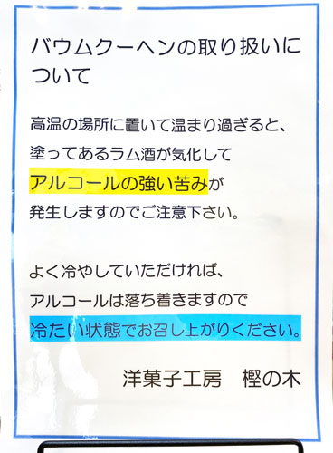バウムクーヘン本体そのものが30度以上の環境で熱を帯びて来ると、浸したラム酒が一気に気化し始めて、アルコールの強い苦味が発生します。